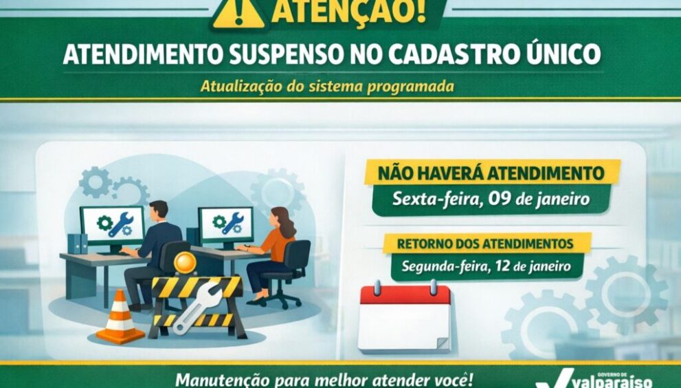 O Cadastro Único informa que, na próxima sexta-feira, dia 09 de janeiro, não haverá atendimento na unidade, em razão de uma atualização programada do sistema. A medida é necessária para garantir a melhoria contínua dos serviços prestados à população.
